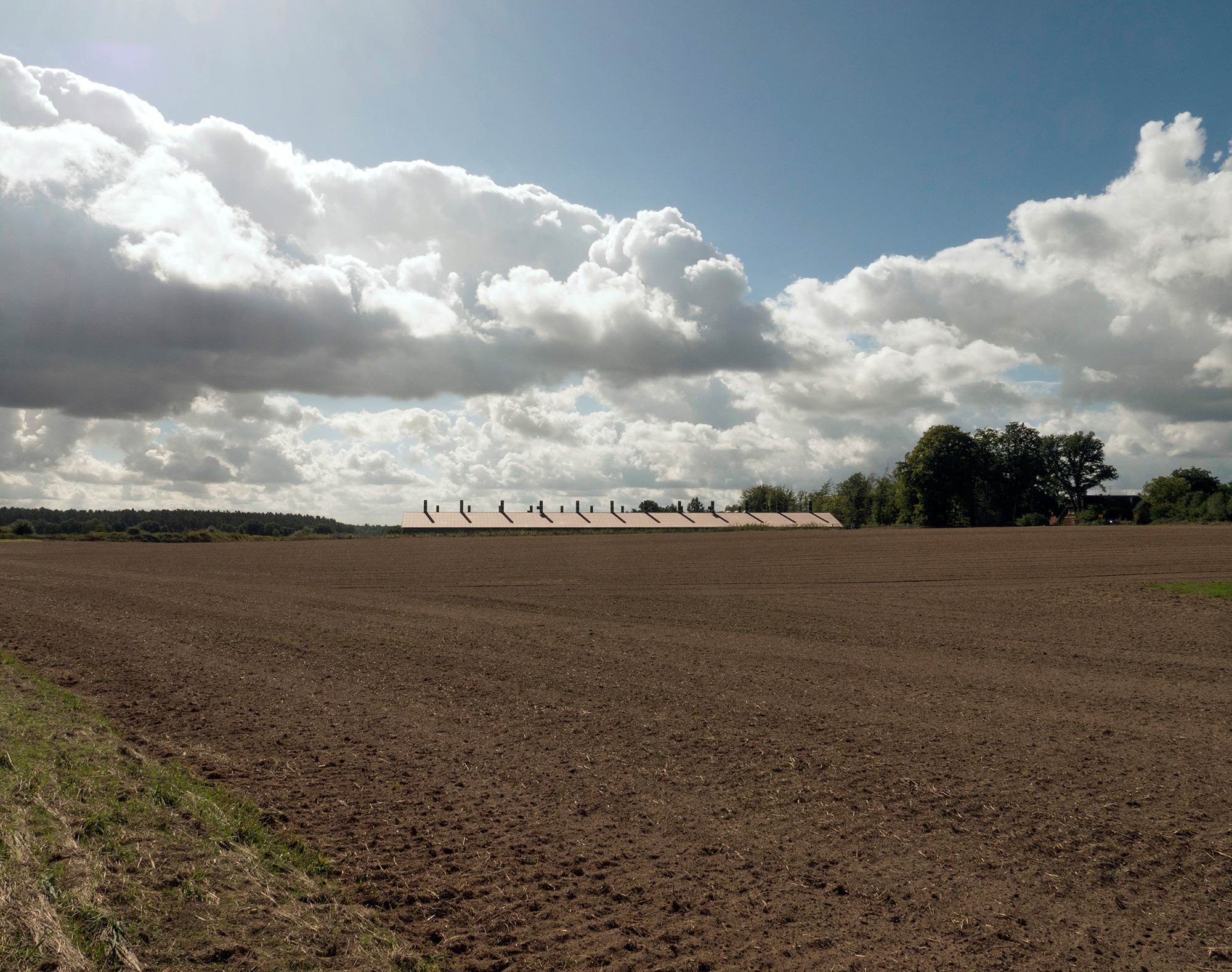 Die Serie »Ställe« zeigt in weiten Blickwinkeln moderne Stallanlagen, die für die Massentierhaltung genutzt werden. Der Begriff »Stall«, der eine kleinteilige, in Menschennähe praktizierte Form der Tierhaltung impliziert, ist hier nicht mehr zutreffend. Diese modernen Ställe dienen der massenhaften Aufzucht und Verwahrung von Tieren zur Herstellung von Fleisch. Sie sind nicht mehr Teil eines Dorfs, sie stehen abseits, unauffällig in die Landschaft eingebettet, dem Blick und der unmittelbaren Konfrontation entzogen.